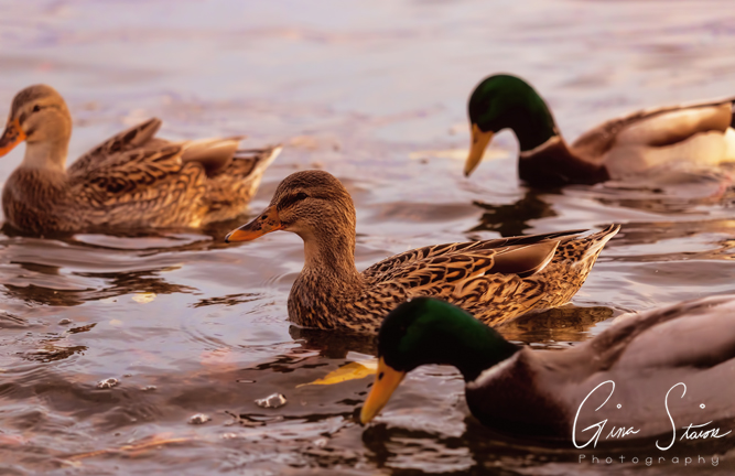 Mallard ducks and a lone Canada goose swim in calm waters during sunset in Toronto, Ontario, Canada.