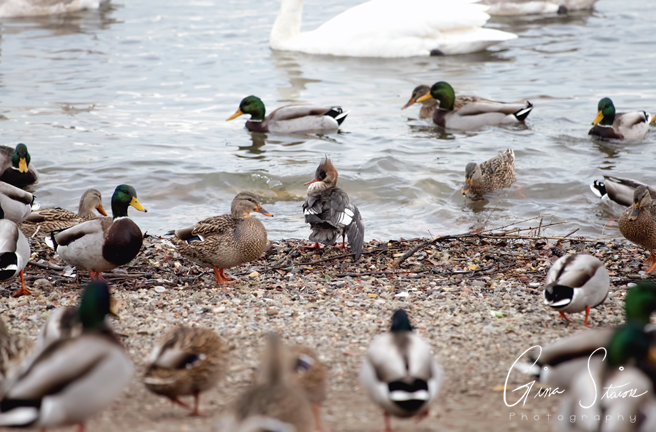 Mallard ducks and a red-breasted merganser spend an afternoon by the lake in Toronto, Ontario, Canada.
