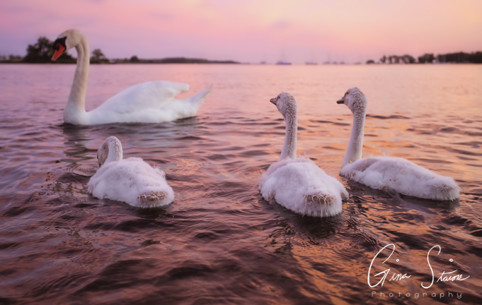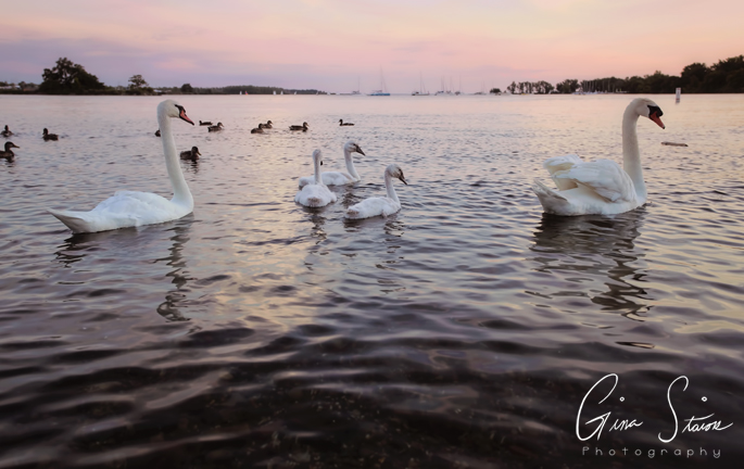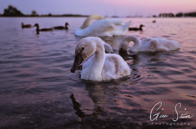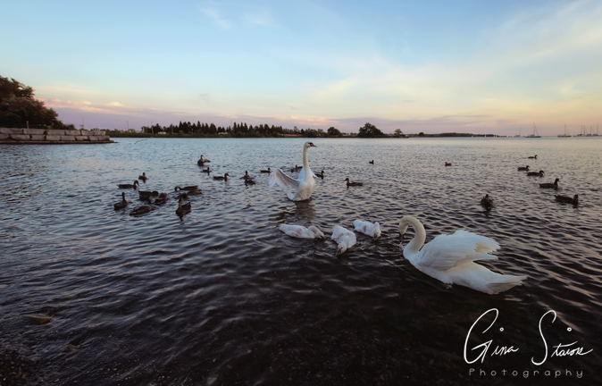 A mute swan family feeding by the lake on a cloudy autumn afternoon in Toronto, Ontario, Canada. A Canada goose spreads its wings out on the lake.