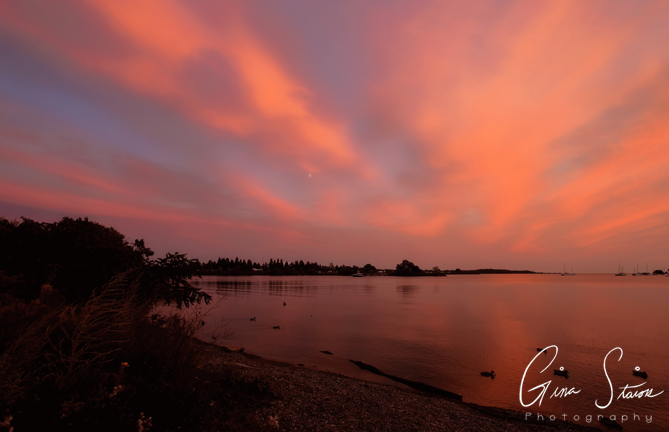 A vibrant sunset sets the sky above the lake ablaze on a peaceful autumn evening in Toronto, Ontario, Canada.