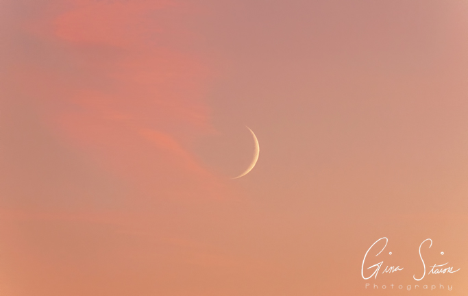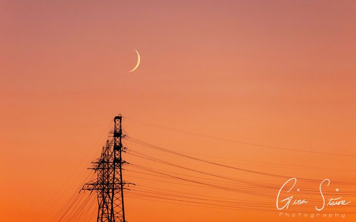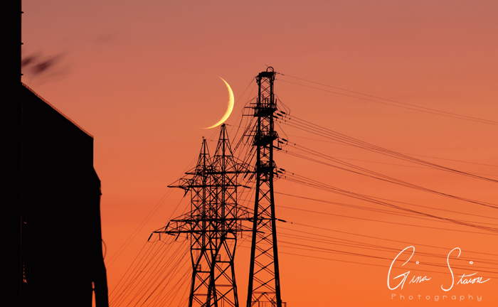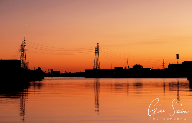 A beautiful orange sunset by the lake on an autumn evening in Toronto, Ontario, Canada. The moon appears as a slim crescent low in the sky.