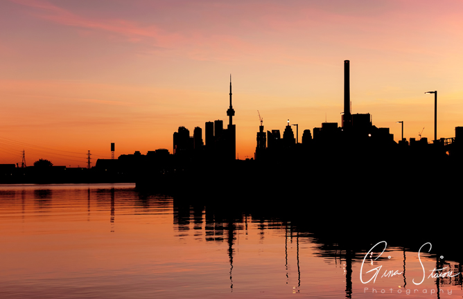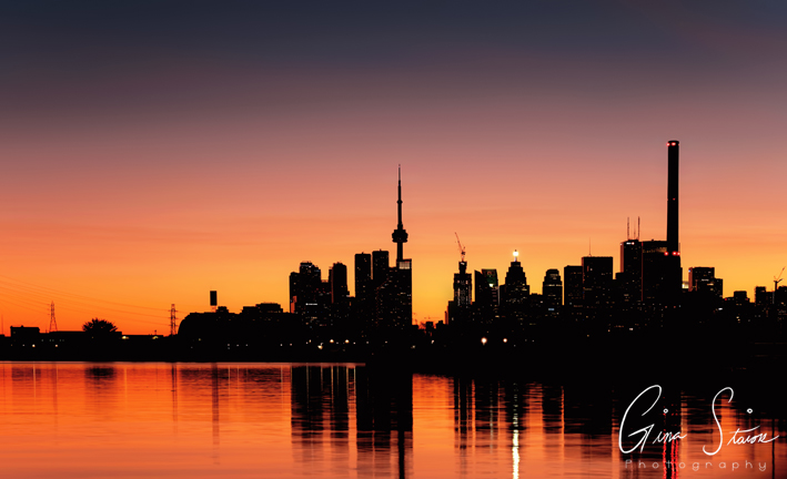 A soft purple sunset turns into a calm blue hour by the lake on an autumn evening in Toronto, Ontario, Canada.
