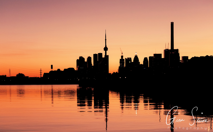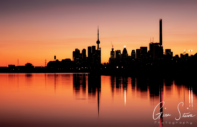 A soft purple sunset matches the city lights and the CN Tower perfectly on a summer evening in Toronto, Ontario, Canada.