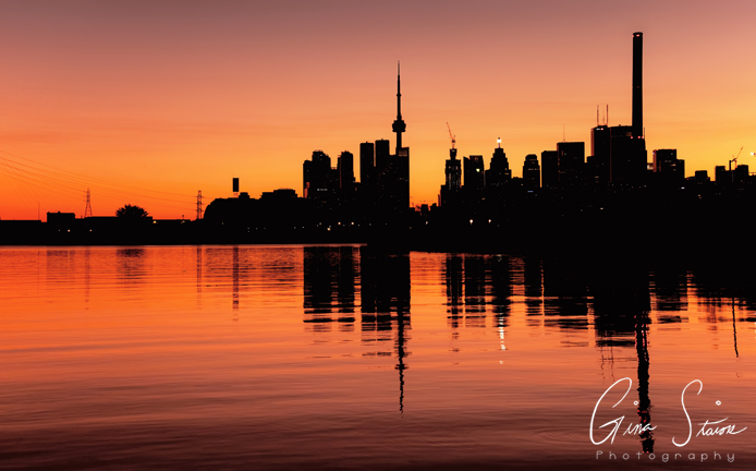 A dramatic sunset paints the sky above the city in shades of red and orange on an autumn evening in Toronto, Ontario, Canada.