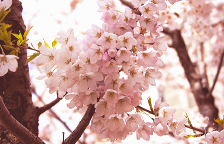 Beautiful cherry blossoms lit up by sunlight and surrounded by a blue sky during spring.