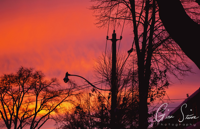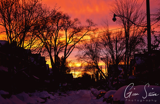 I was indoors when I noticed the sky above the backyard was turning orange. The snow had lessened by that point but my heart sank to my stomach knowing that I wouldn’t be able to travel to get photos of what looked to be a promising sunset. I ran to the front of the house to look outside and sure enough, the sky was transforming into a beautiful mix of red and orange. While it wasn’t ideal, I wasn’t about wallow in self pity when I could get my winter gear on, and take photos from the street. And that’s exactly what I did. I’m so relieved that I was able to capture the beautiful sky without having to go out of my way.