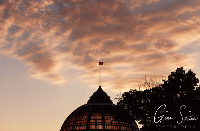 An outline of the sun is visible as it approaches the horizon in one of the last sunsets of summer in Toronto, Ontario, Canada.