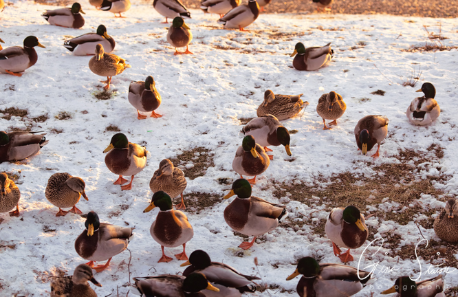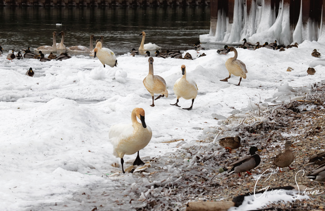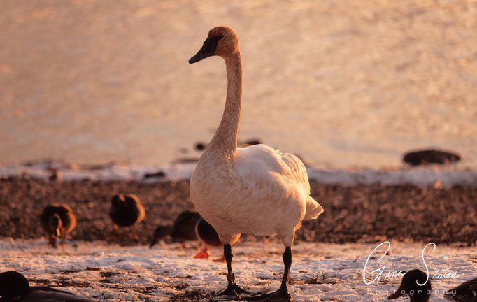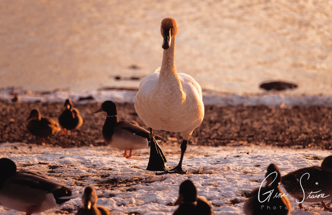 Mallard ducks and trumpeter swans bathed in golden hour sunlight by the lake just before winter in Toronto, Ontario, Canada. The trumpeter swan family marches towards the shore, almost in sync.