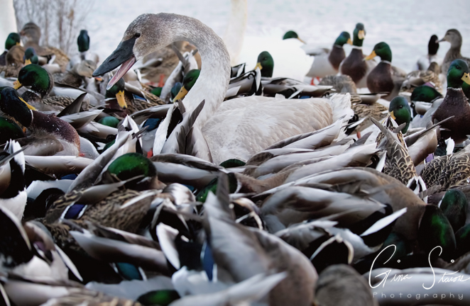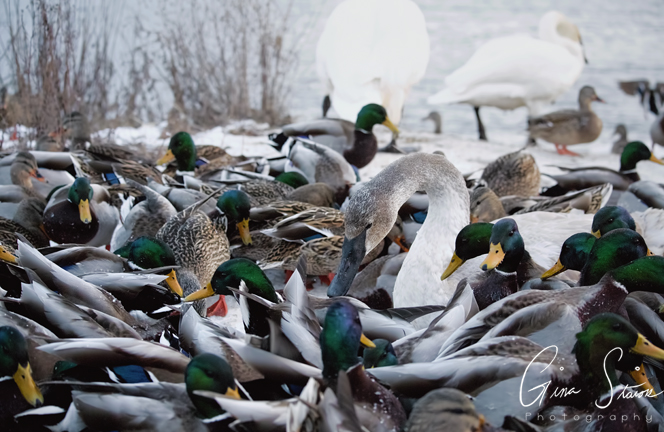 A large group of mallard ducks surround a trumpeter swan cygnet as they all forage for food on a winter day in Toronto, Ontario, Canada.