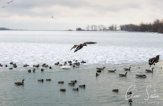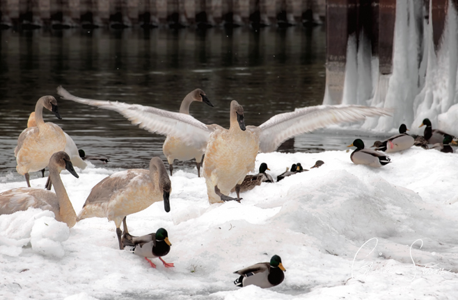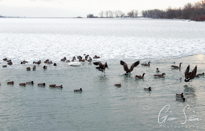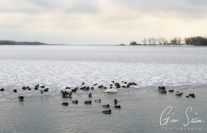 Trumpeter swans, Canada geese, and mallard ducks frolic around a snow covered beach during a winter evening in Toronto, Ontario, Canada.