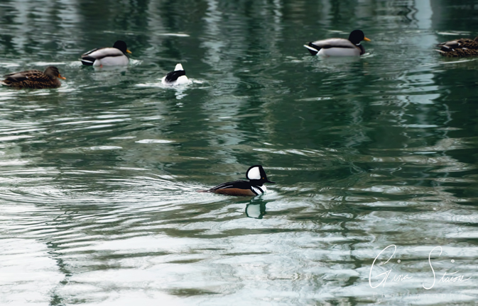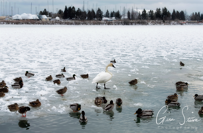 Trumpeter swans, mute swans, mallard ducks, and buffleheads swim around Lake Ontario during a cloudy winter afternoon in Toronto, Ontario, Canada.