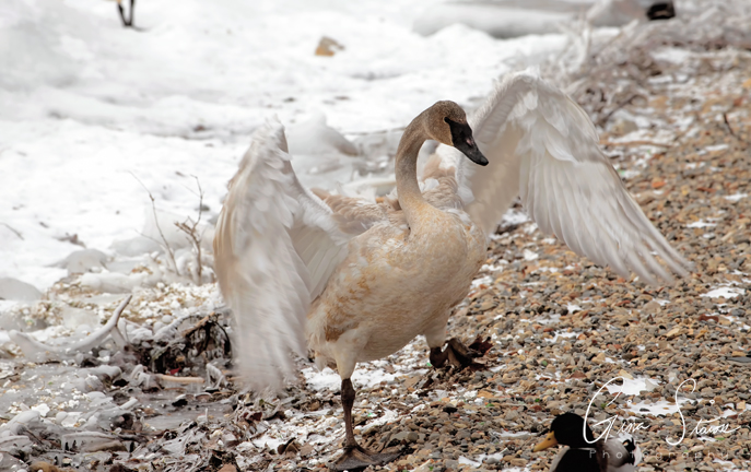 A trumpeter swan enjoys a sunny afternoon by the water in Toronto, Ontario, Canada.