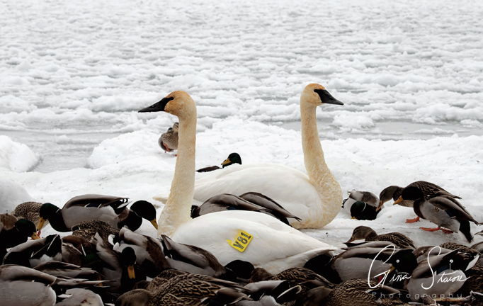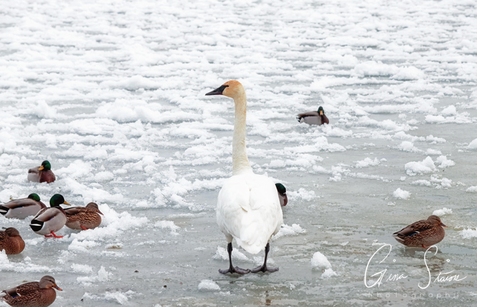 A large group of mallard ducks surround a trumpeter swan cygnet as they all forage for food on a winter day in Toronto, Ontario, Canada.