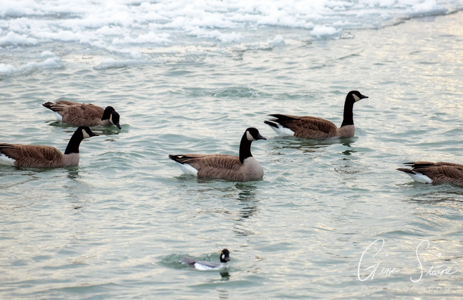 Trumpeter swans, Canada geese, and mallard ducks frolic around a snow covered beach during a winter evening in Toronto, Ontario, Canada.