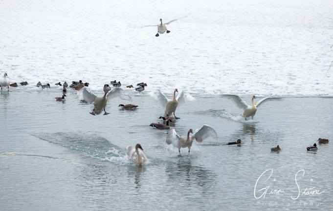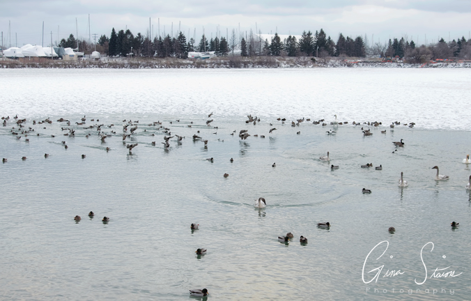 Trumpeter swans, mute swans, mallard ducks, and buffleheads swim around Lake Ontario during a cloudy winter afternoon in Toronto, Ontario, Canada.