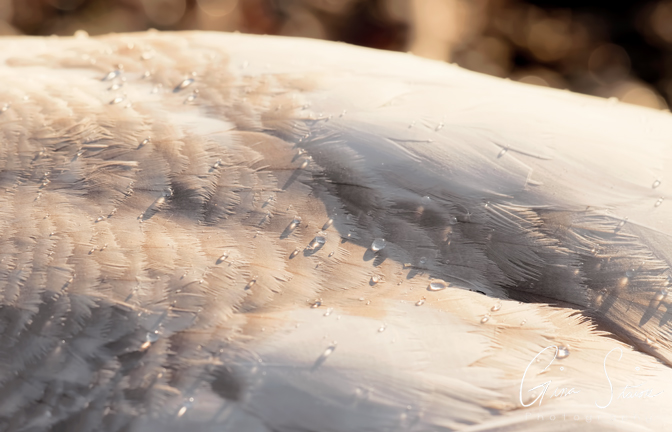 Perfect little round water droplets sit neatly upon a swan’s back during golden hour in Toronto, Ontario, Canada. The way in which the sunlight illuminates the droplets make this swan look almost angelic.