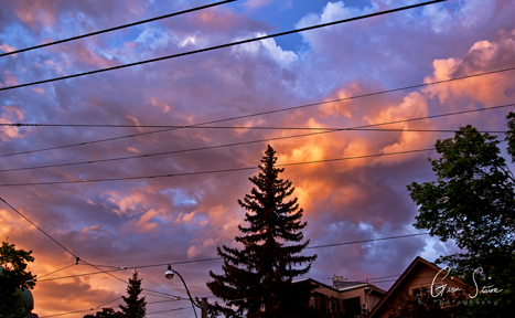 A flock of European starlings perch on electrical wires and surrounding trees on a clear summer day in Toronto, Ontario, Canada.