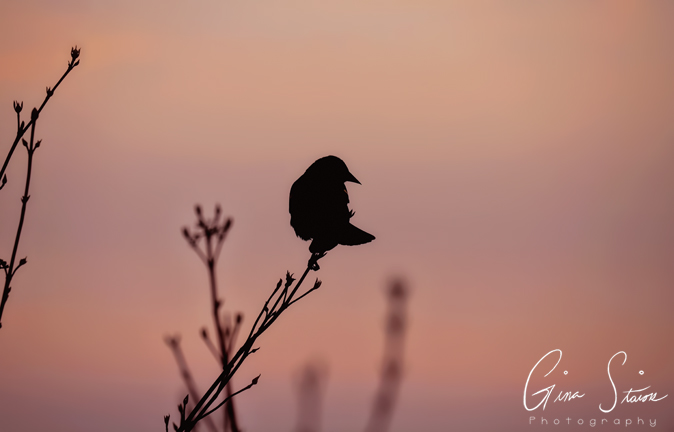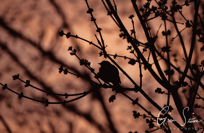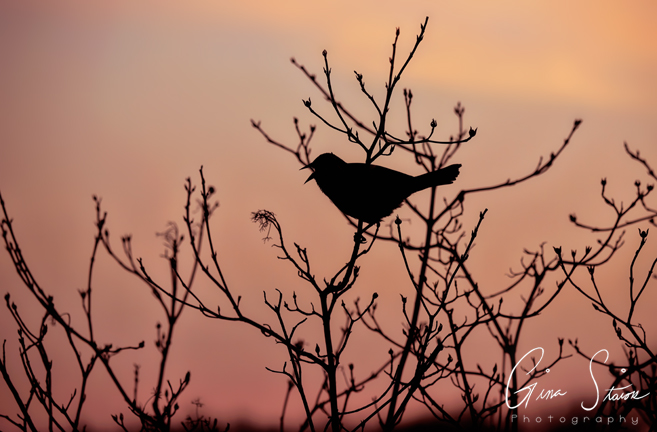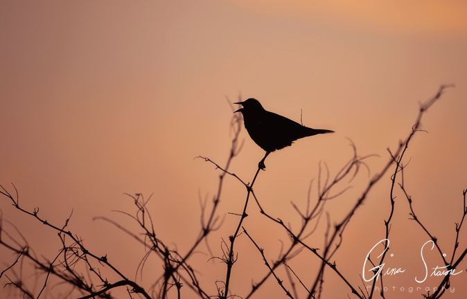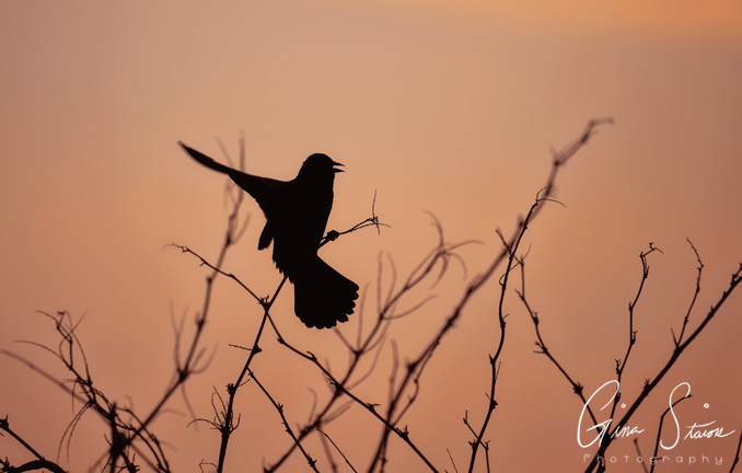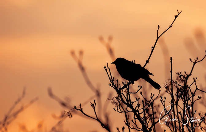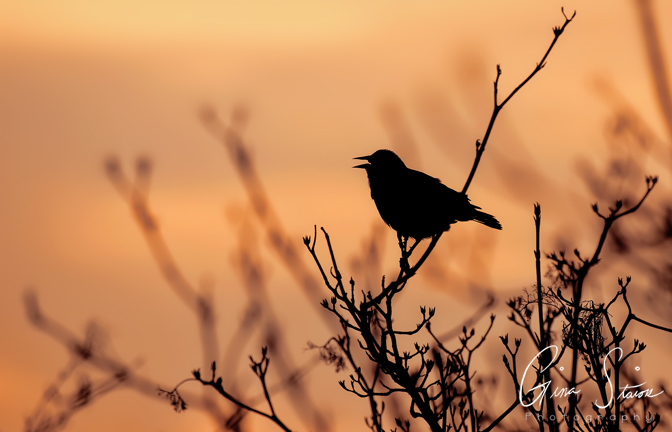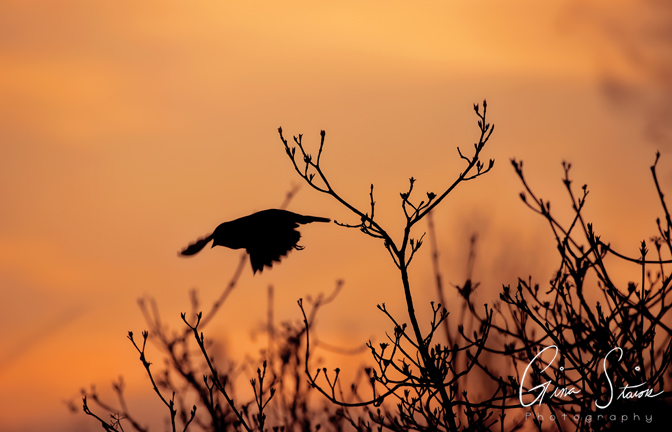 Red-winged blackbirds perch on bare tree branches during an orange sunset on a spring evening in Toronto, Ontario, Canada.