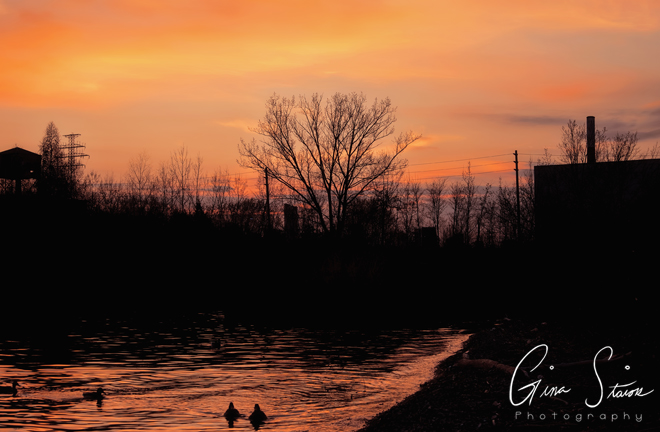 A red and orange sunset above the lake during a peaceful spring evening in Toronto, Ontario, Canada.