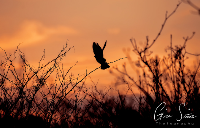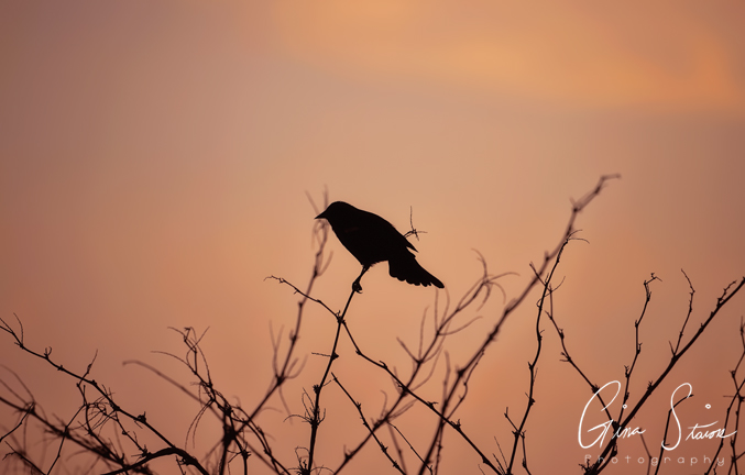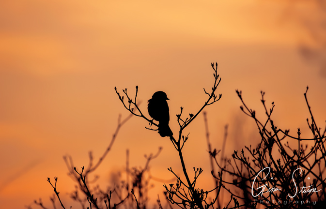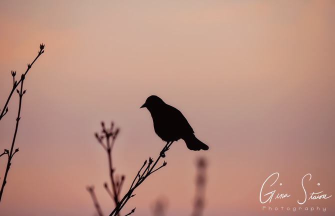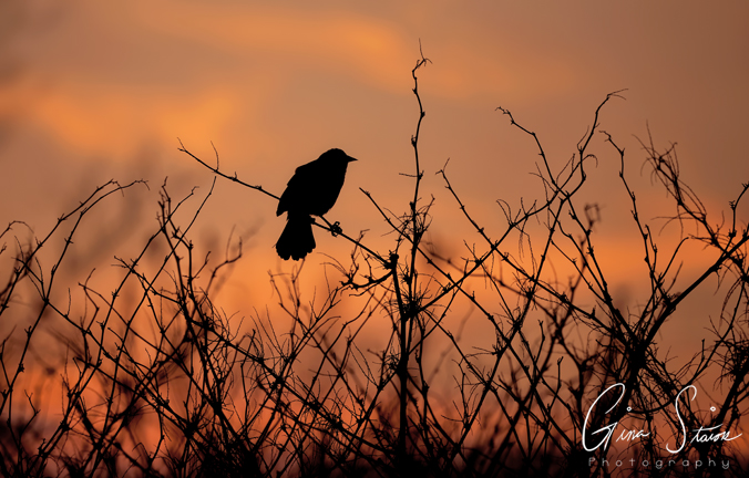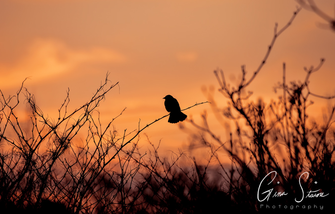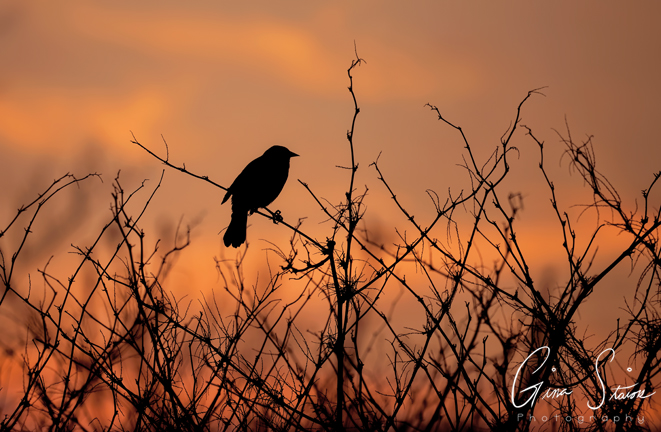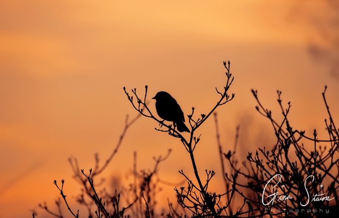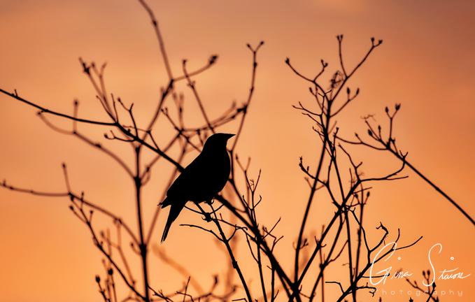 Red-winged blackbirds perch on bare tree branches during an orange sunset on a spring evening in Toronto, Ontario, Canada.